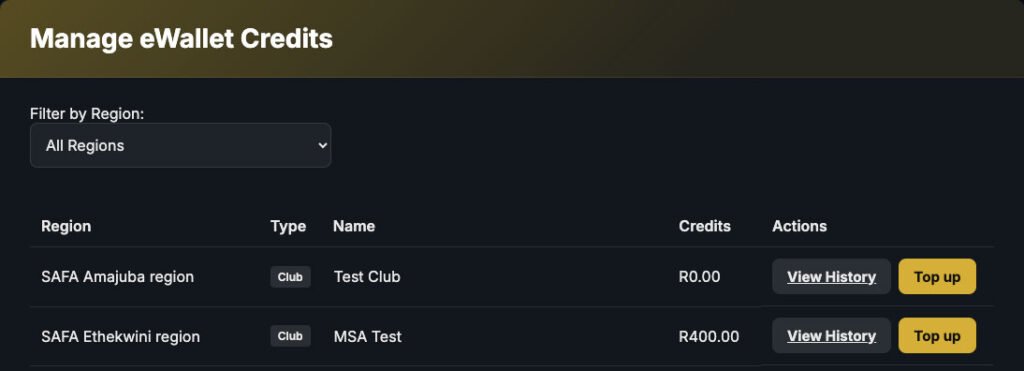 Here, you can view all the clubs that you manage with the option of topping up their eWallet credits.